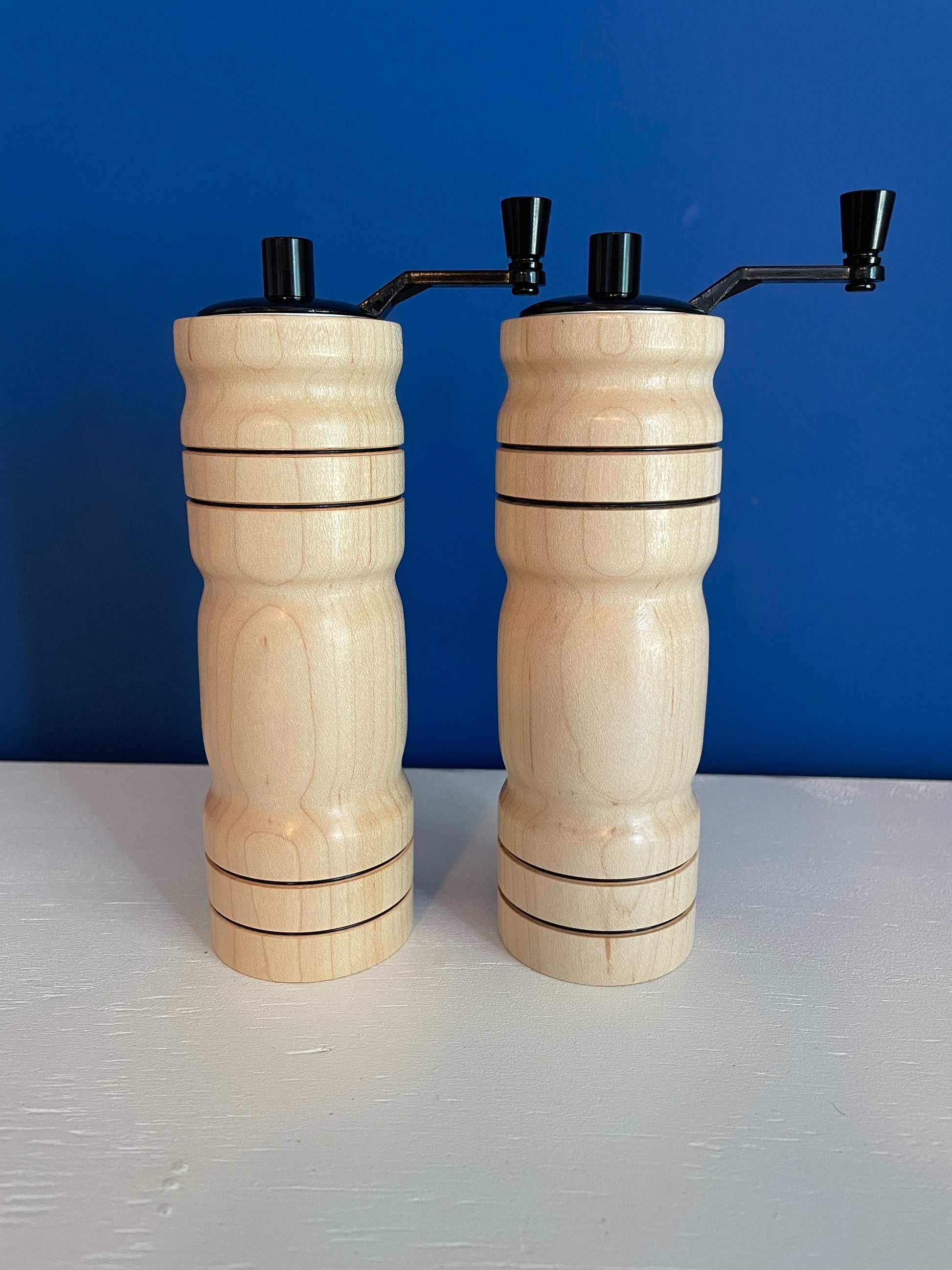 These beautiful Hand Crank Pepper Mill/Salt Grinders in a black finish are a great addition to any kitchen! The grain of the turned maple wood dazzles and shines with a walnut oil and wax finish.