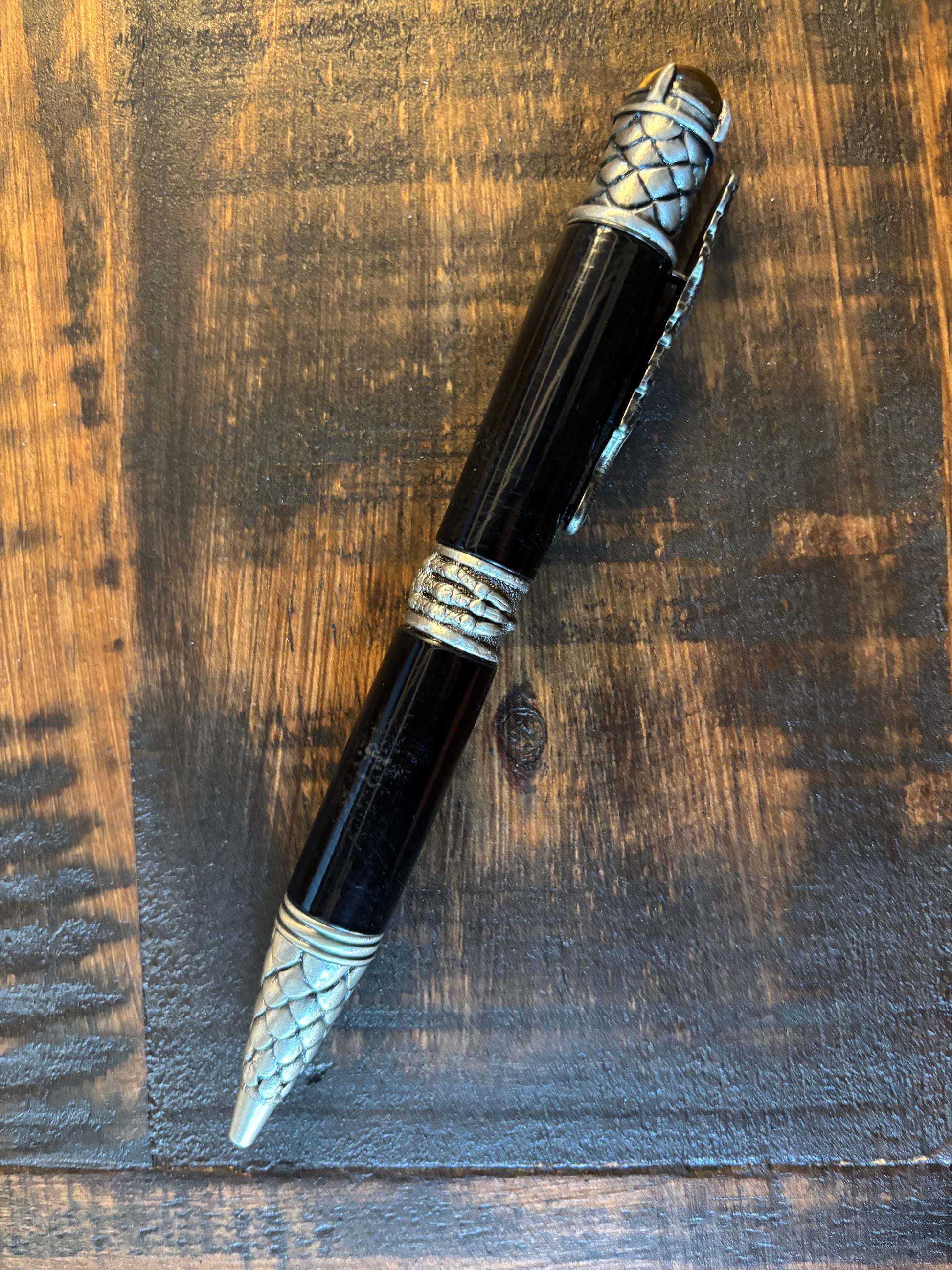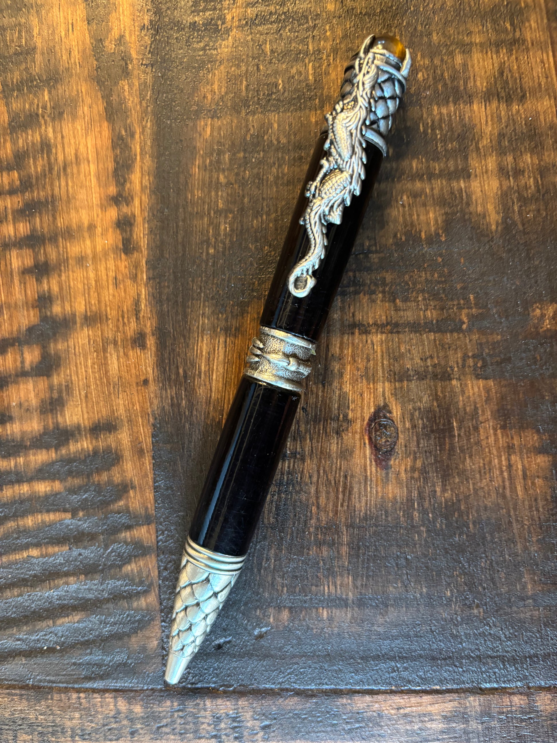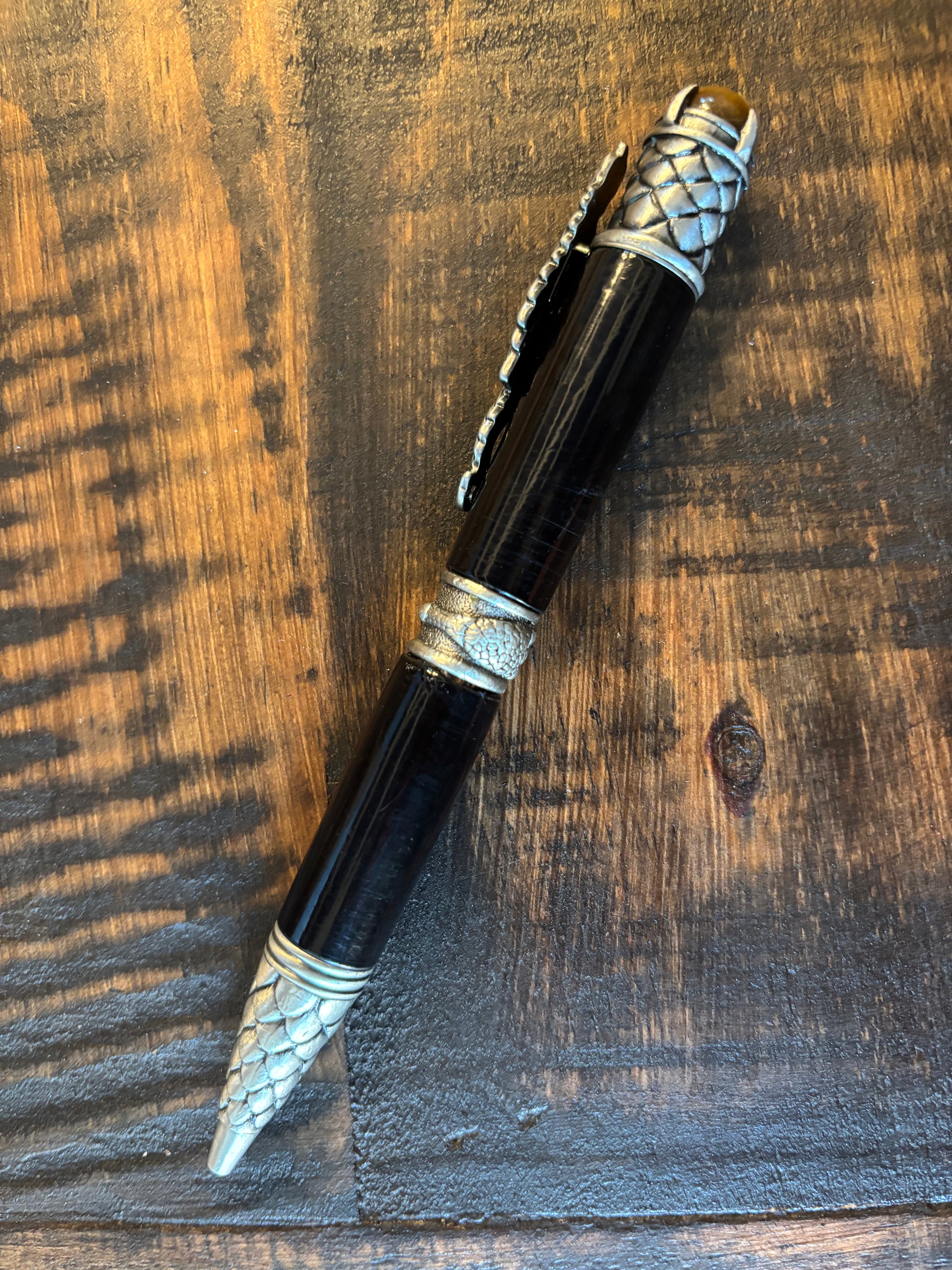 This executive style pen with an antique pewter finish comes with ebony wood and lots of character! The wood has a durable CA finish. The clip is a full body dragon. The band features a dragon claw grasping the center. The pen tip and end cap are covered in the armored scales of the dragon, and there is a Tigers Eye crystal on the end, gripped in place by additional talons. The pen is a twist style to engage and retract the pen. It is perfect for everyday use!