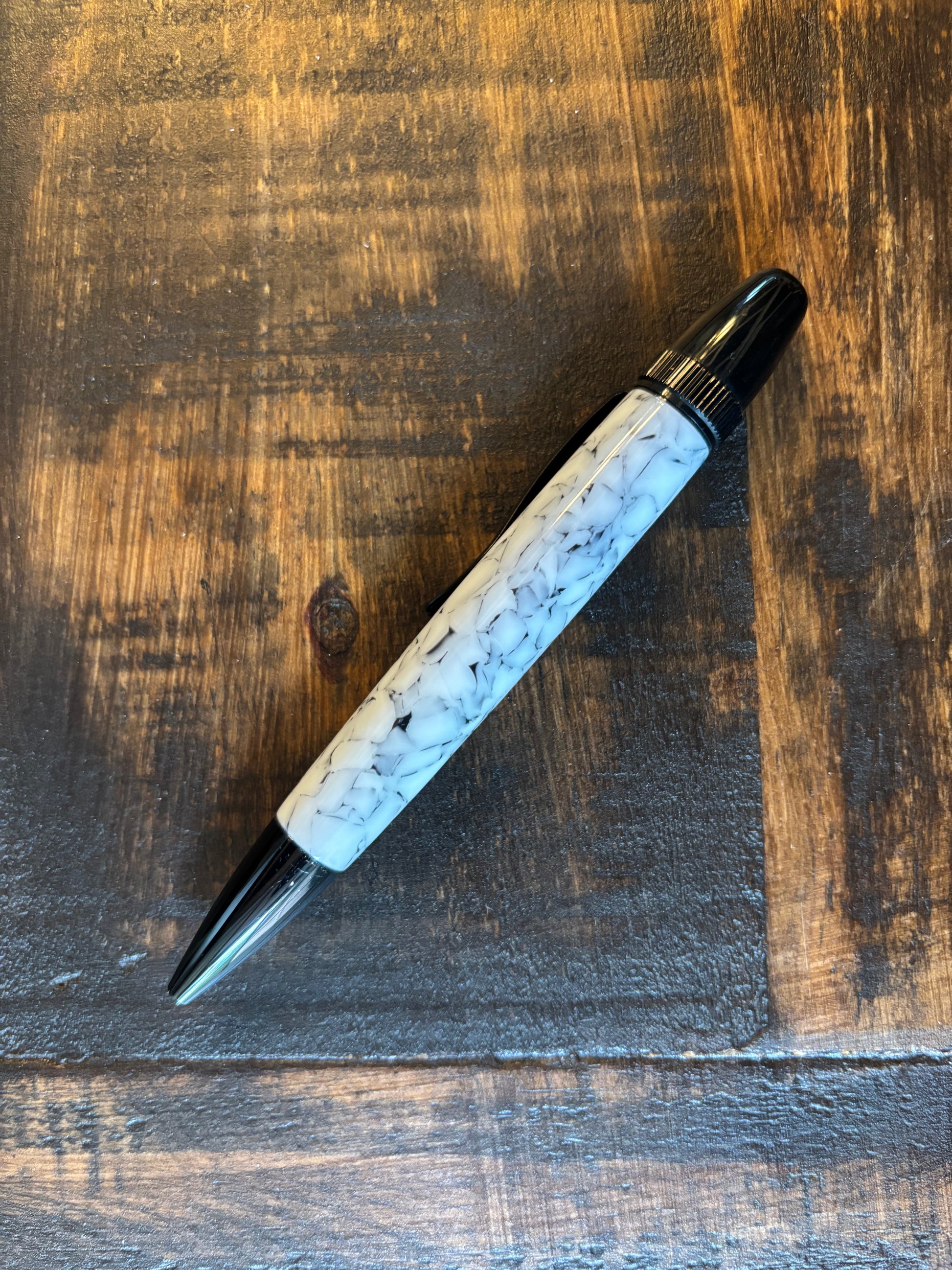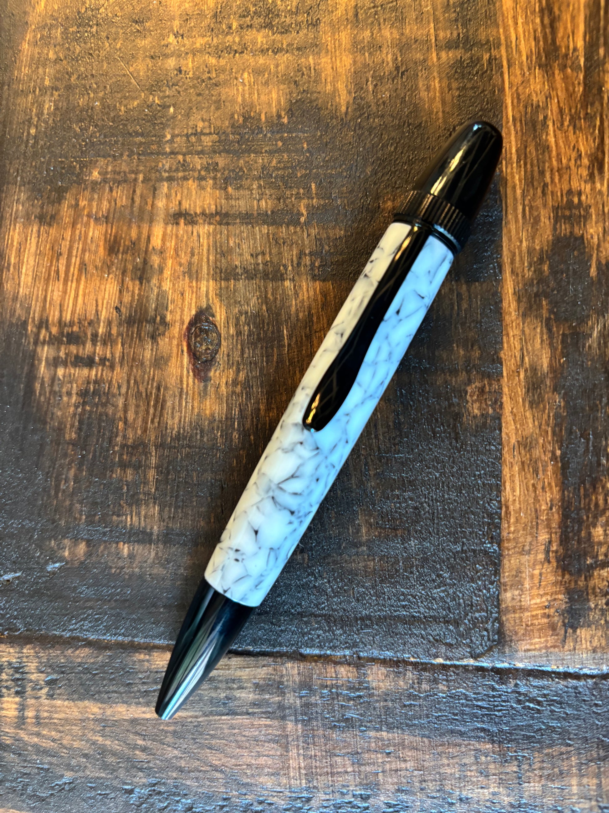 This Atlas Pen in black enamel finish comes with a patterned white acrylic and is such a fun design! The acrylic has a durable CA finish that adds a protective shine. The long body gives this pen a sleek, elegant look. The pen is a twist style to engage and retract the pen. It’s a showstopper for sure!