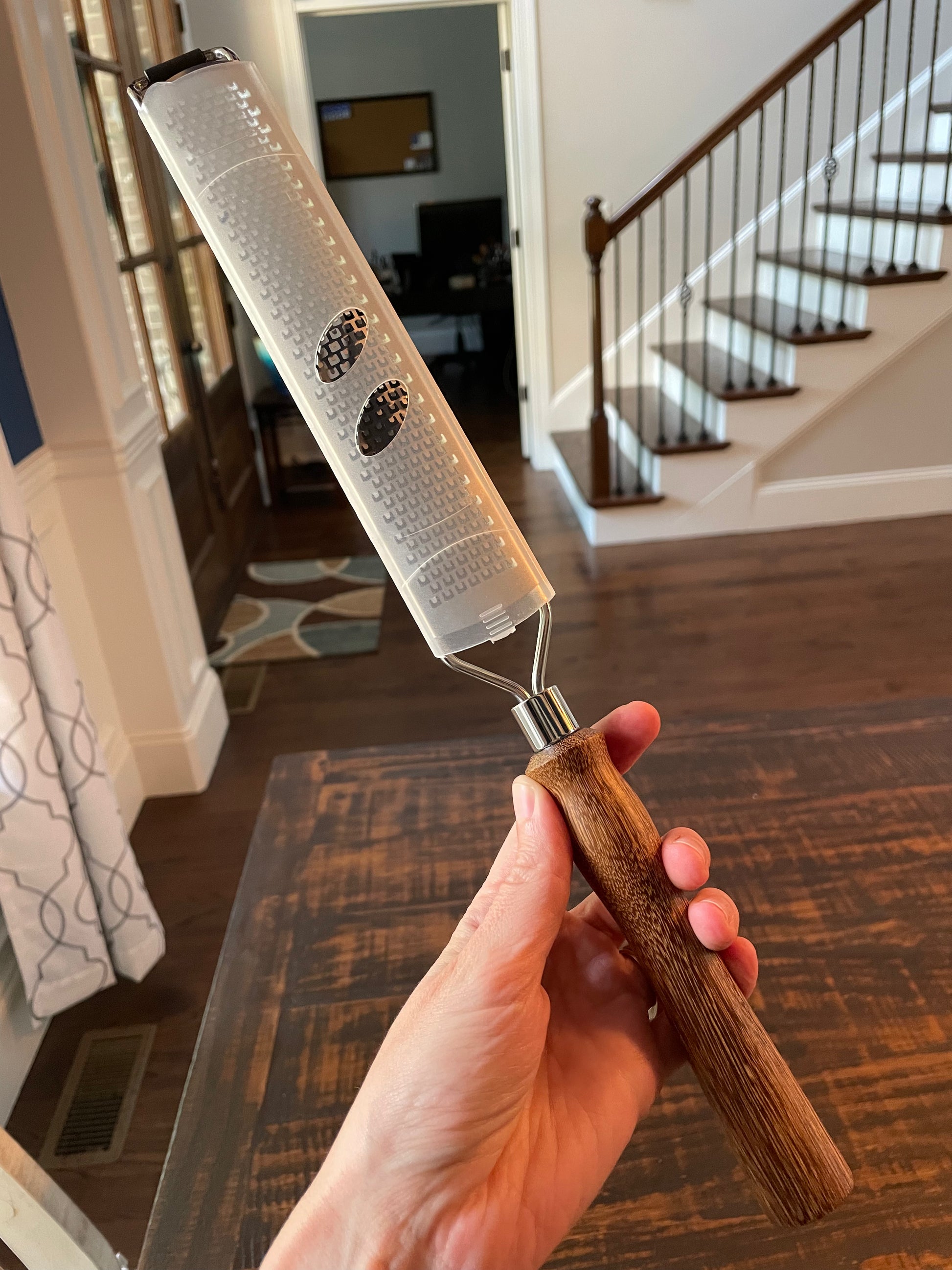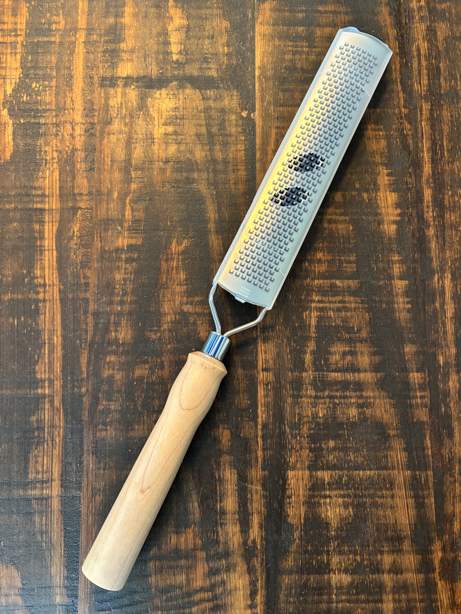 If you are looking for the perfect tool for finely grating items like garlic, ginger, parmesan cheese, citrus zest, and more, then look no further. This rasp grater excels in its job AND is a gorgeous addition to your kitchen utensils. When you are finished using it each time, simply unscrew the handle, put the metal rasp grater in the dishwasher, then reattach the handle after the wash. To clean the handle, wipe down with mild soapy water and dry thoroughly (don't let wood soak in water and don't leave it wet).