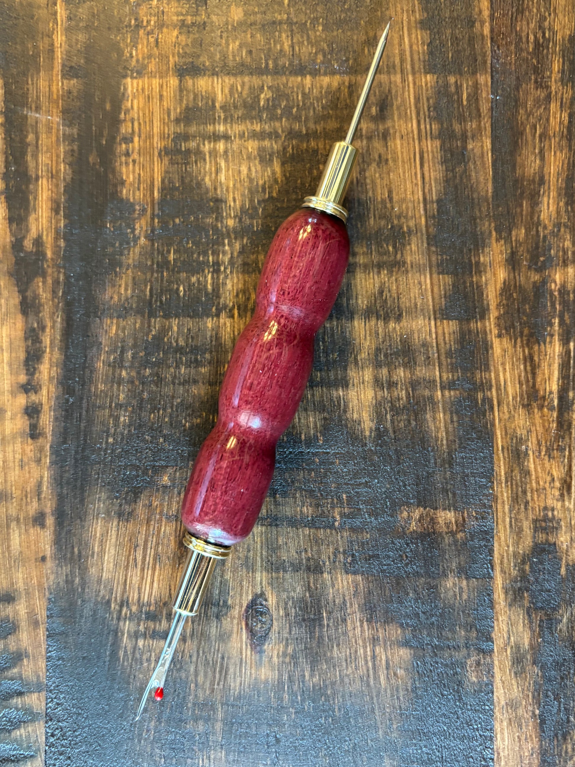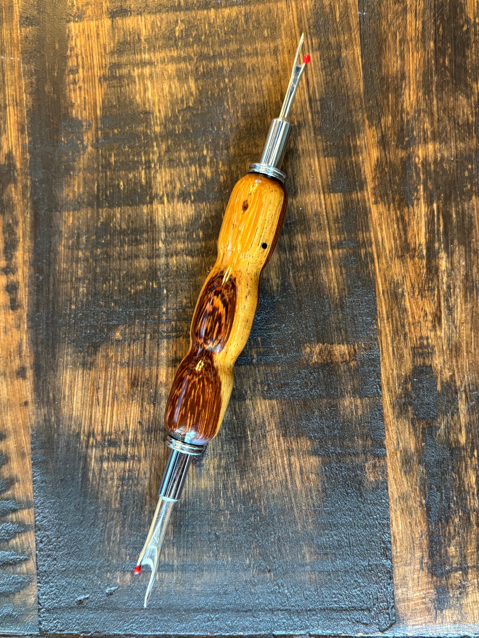 Calling all seamstresses! Here is your chance to own a beautiful wood-handled double seam ripper or seam ripper/stiletto combo tool. The metal is in a chrome or gold finish, while the curved wood features a durable CA finish. The curved design of the wood handle offers comfort of use, but also showcases the natural grain of the wood.