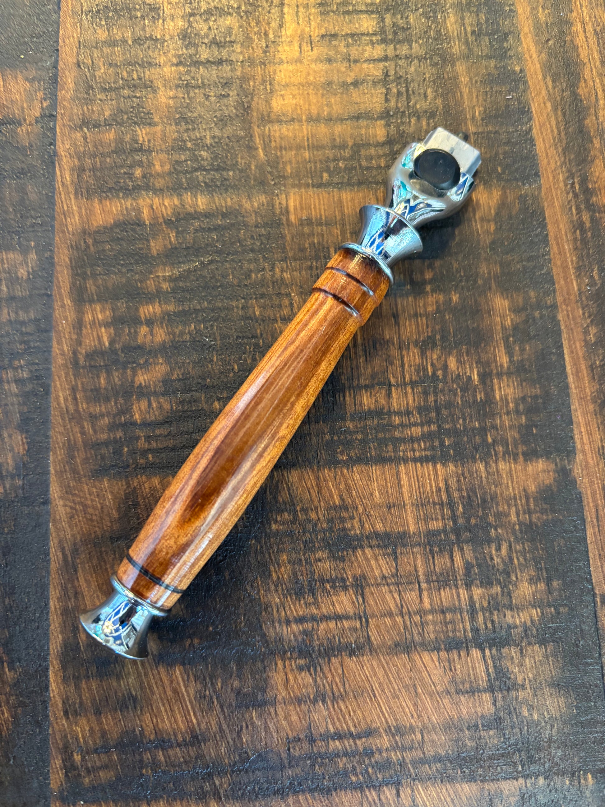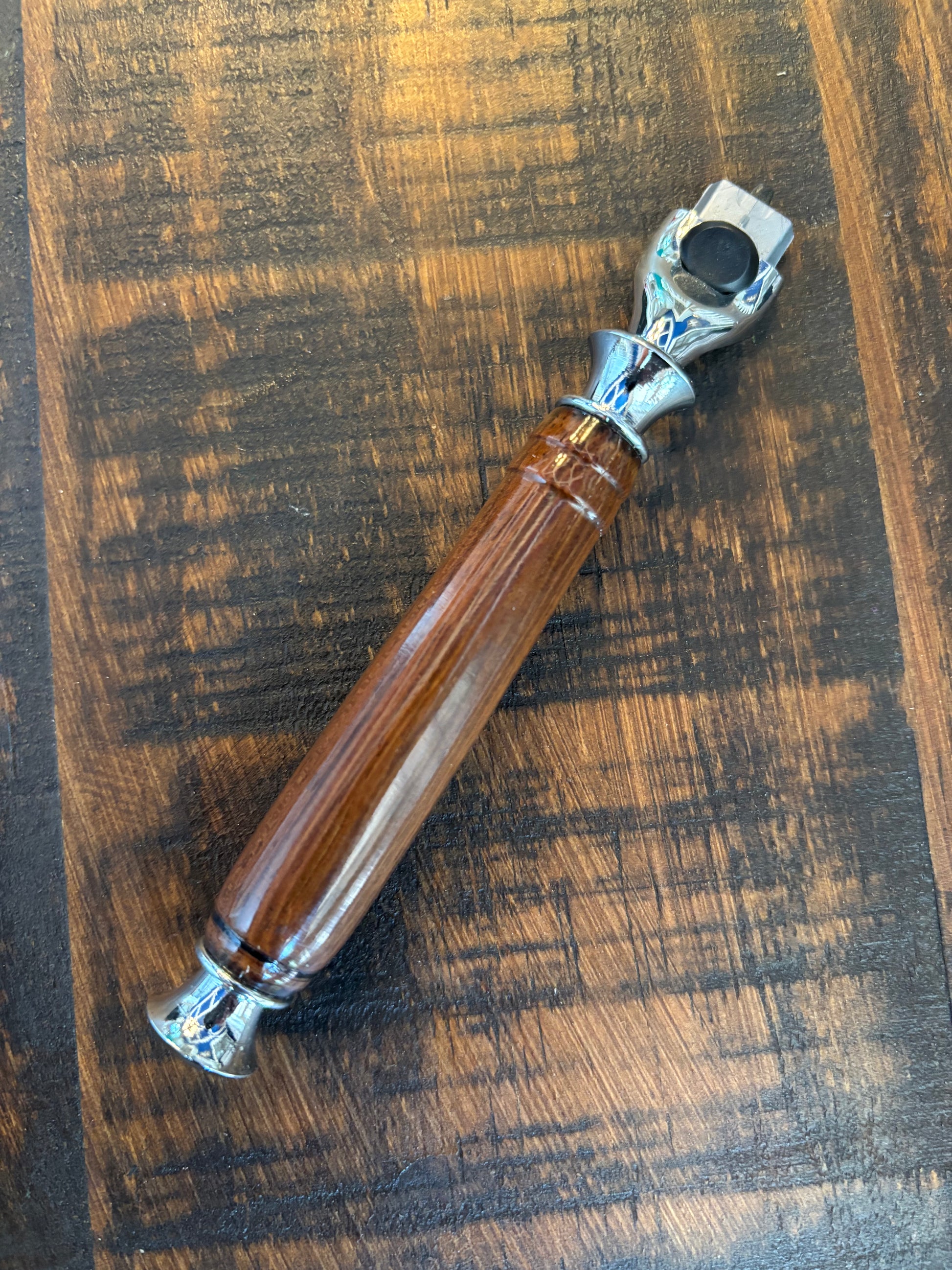 Looking for a unique but useful gift? Here it is! This is a handcrafted handle that works with all Mach3 Razors. It features chrome or gunmetal accents (as pictured) and a hand-sculpted wooden handle. The wood has a durable CA finish that provides the ultimate shine and protection for years to come. Please note that each piece of wood is unique and may not look exactly as pictured.