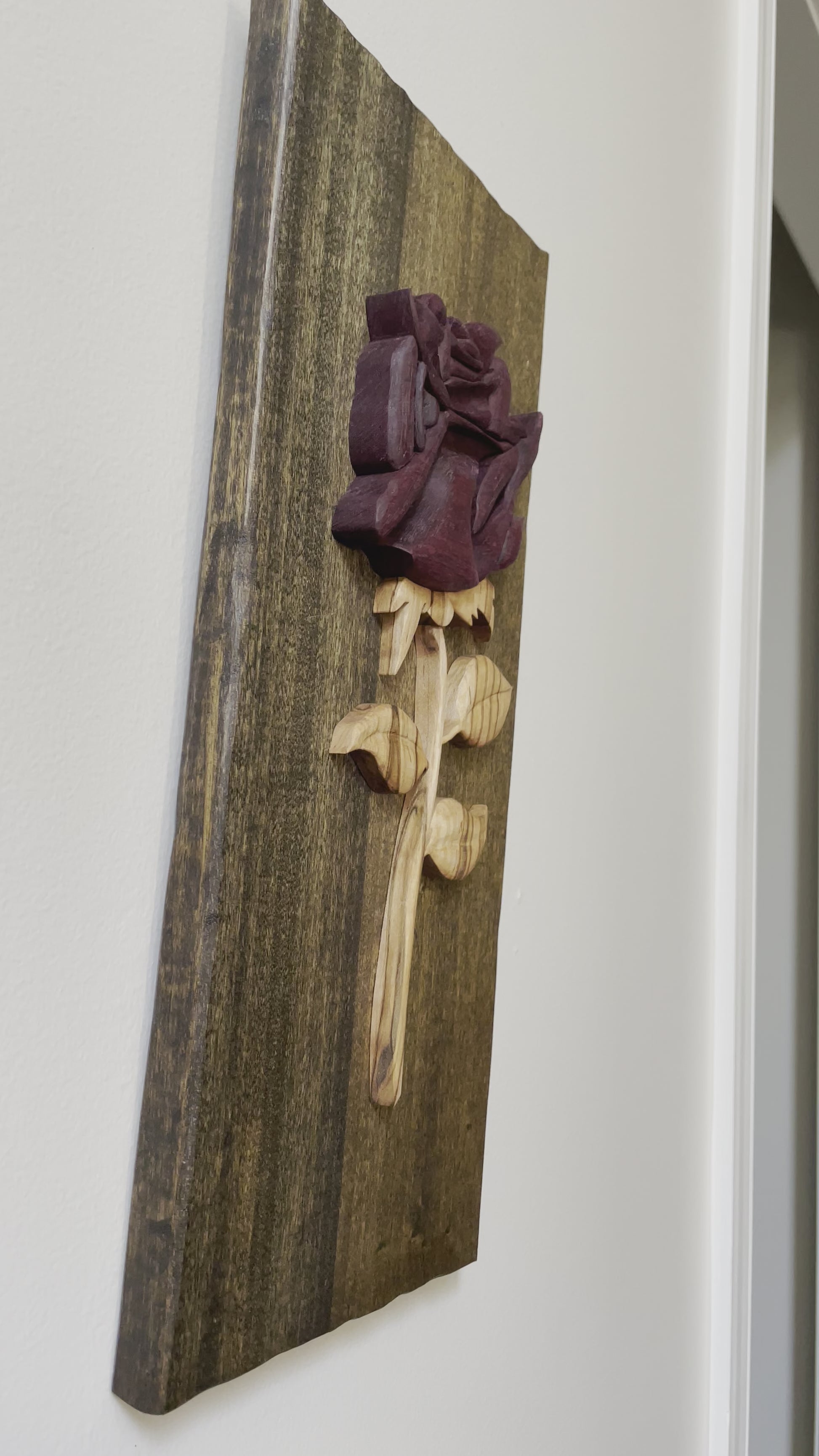 This wood wall art piece was designed, cut, carved, shaped, sanded, and assembled - all by hand and with the utmost attention to detail. The rustic beauty draws you in, and its name, “Midnight Bloom,” comes from the dark purpleheart rose that thrives in every situation. The vibrant colors come from the woods: ambrosia maple and purpleheart. No dyes or stains were added to the flower and stem. These are the natural wood colors! A colorless oil was applied to show off the natural wood and make the grain pop.There is stain on the backer which is poplar wood, and the color is dark walnut. There is a sawtooth style hanger on the back, making it ready to hang right away!Each piece is unique because of the differences in the wood and being made completely by hand. No two art pieces are exactly alike! The back is signed by the artist. The total measurements of the piece are 17.5” high x 7.75” wide x 1.5" deep.