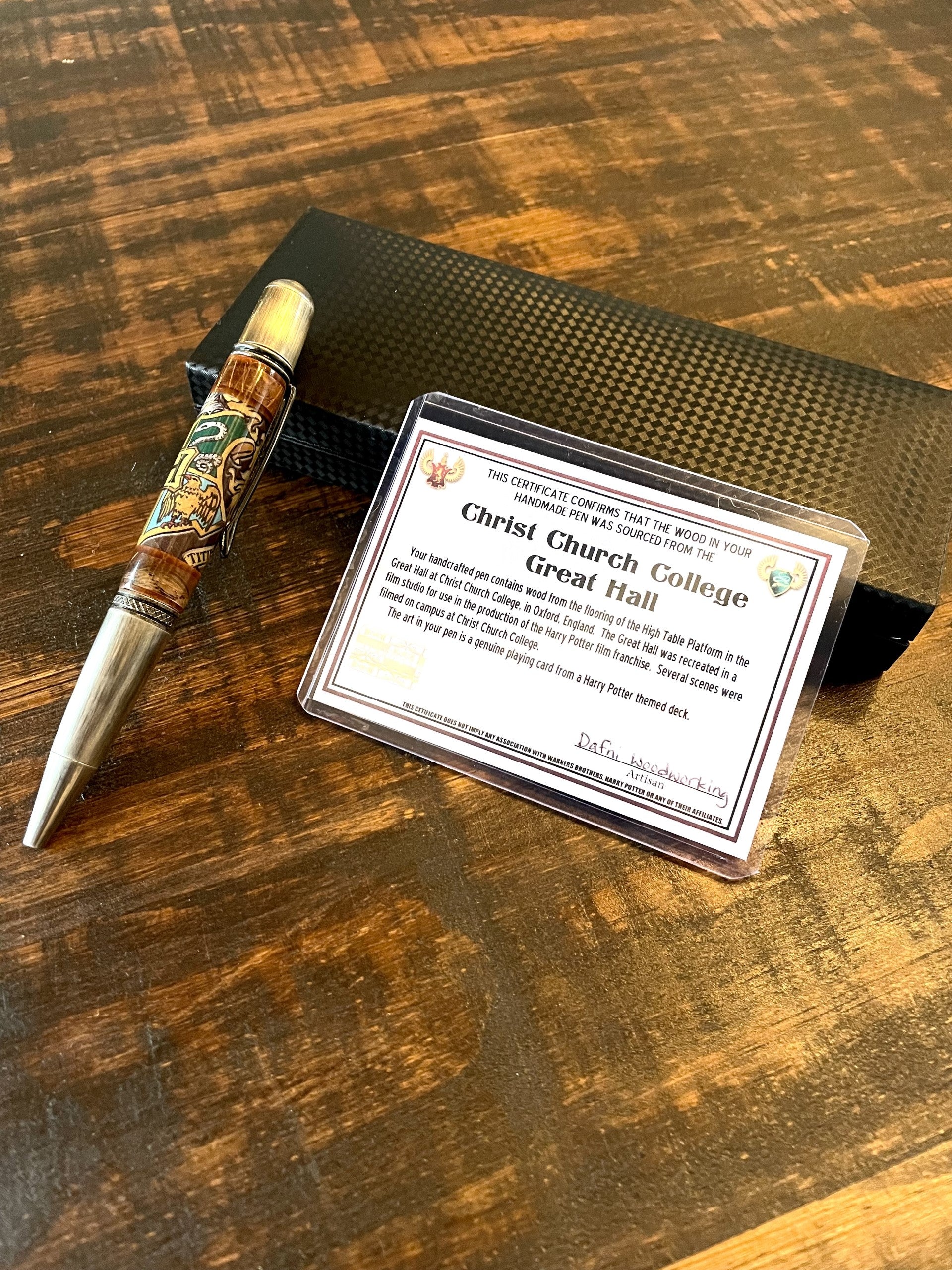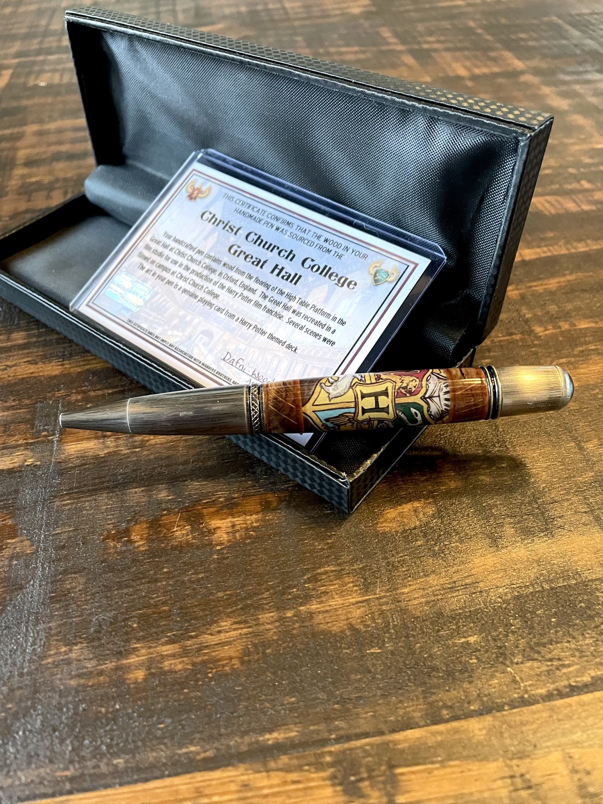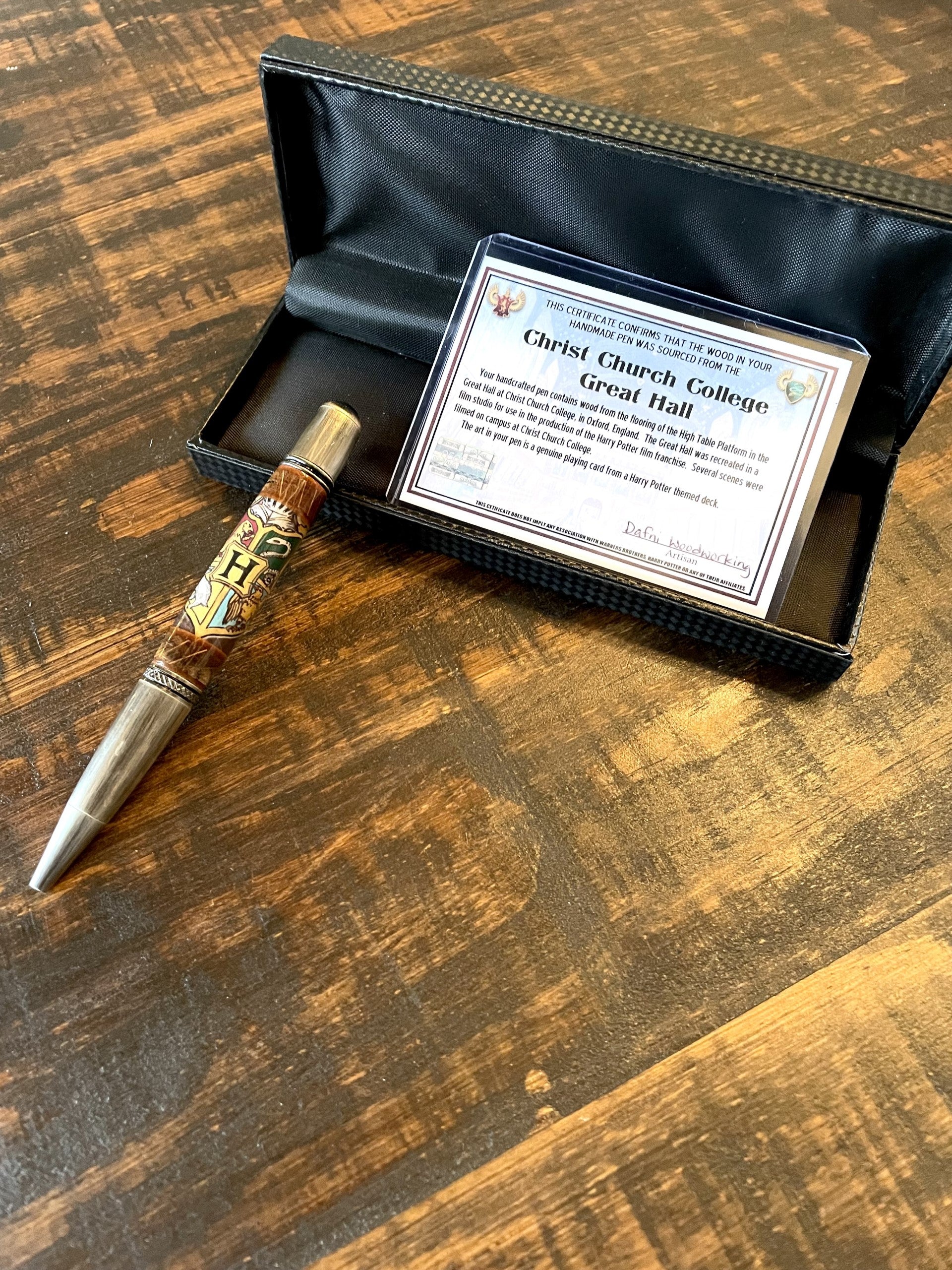 Own a piece of Harry Potter history with this custom Christ Church College Great Hall ball point pen! This handcrafted pen contains wood from the flooring of the High Table Platform in the Great Hall at Christ Church College in Oxford, England. The Great Hall was recreated in a film studio for use in the production of the Harry Potter Film franchise. Several scenes were filmed on campus at Christ Church College.