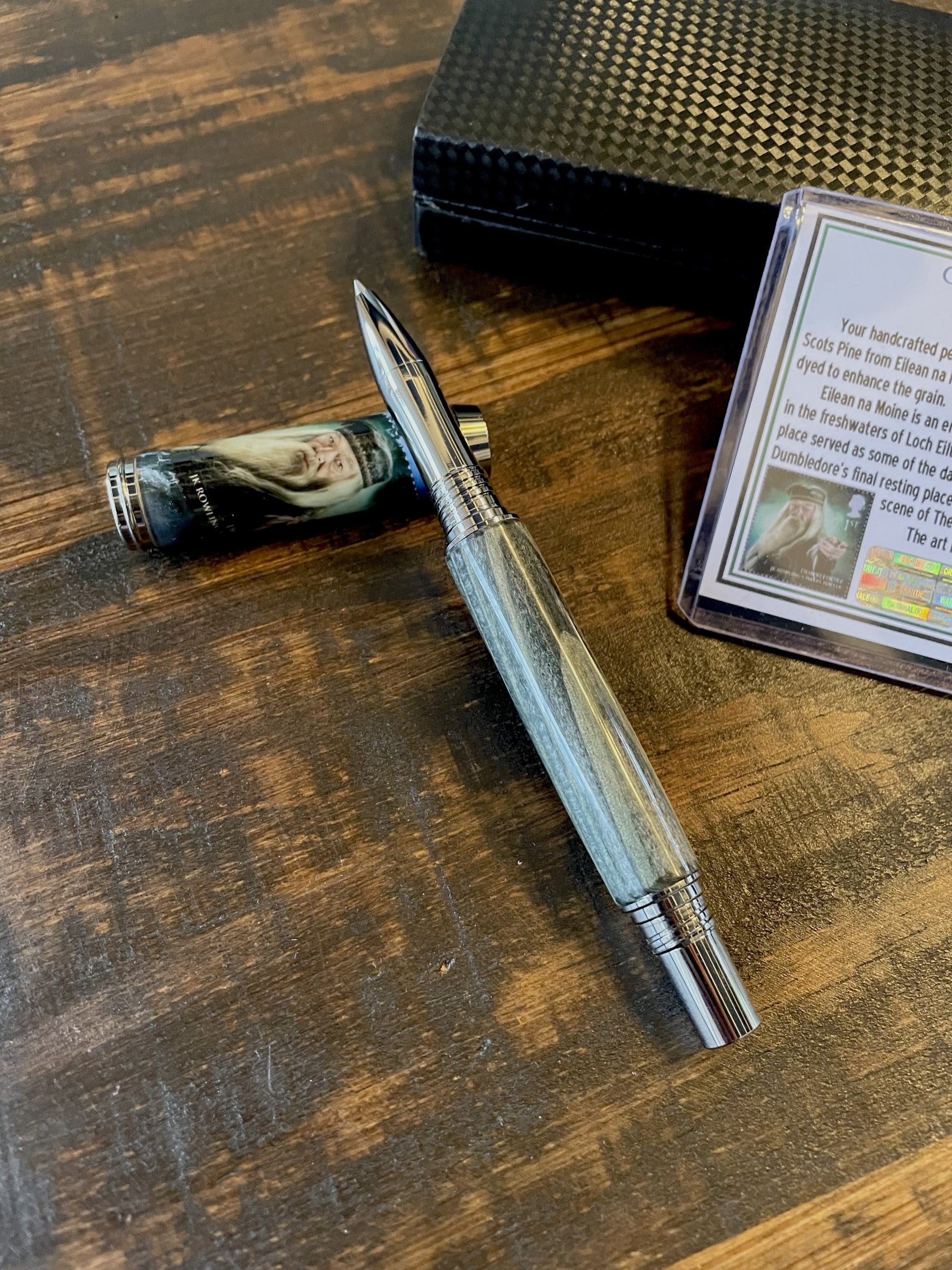 This one of a kind pen is a must-have for Harry Potter fans. This handcrafted rollerball pen was made using Scots Pine from Eilean na Moine. Eilean na Moine is an enchanting island set in the freshwaters of Loch Eilt. This beautiful place served as some of the darkest Harry Potter scenes in Scotland. This particular island is Dumbledore's final resting place and where Voldemort stole the Elder Wand in the final scene of The Deathly Hallows Part 1.