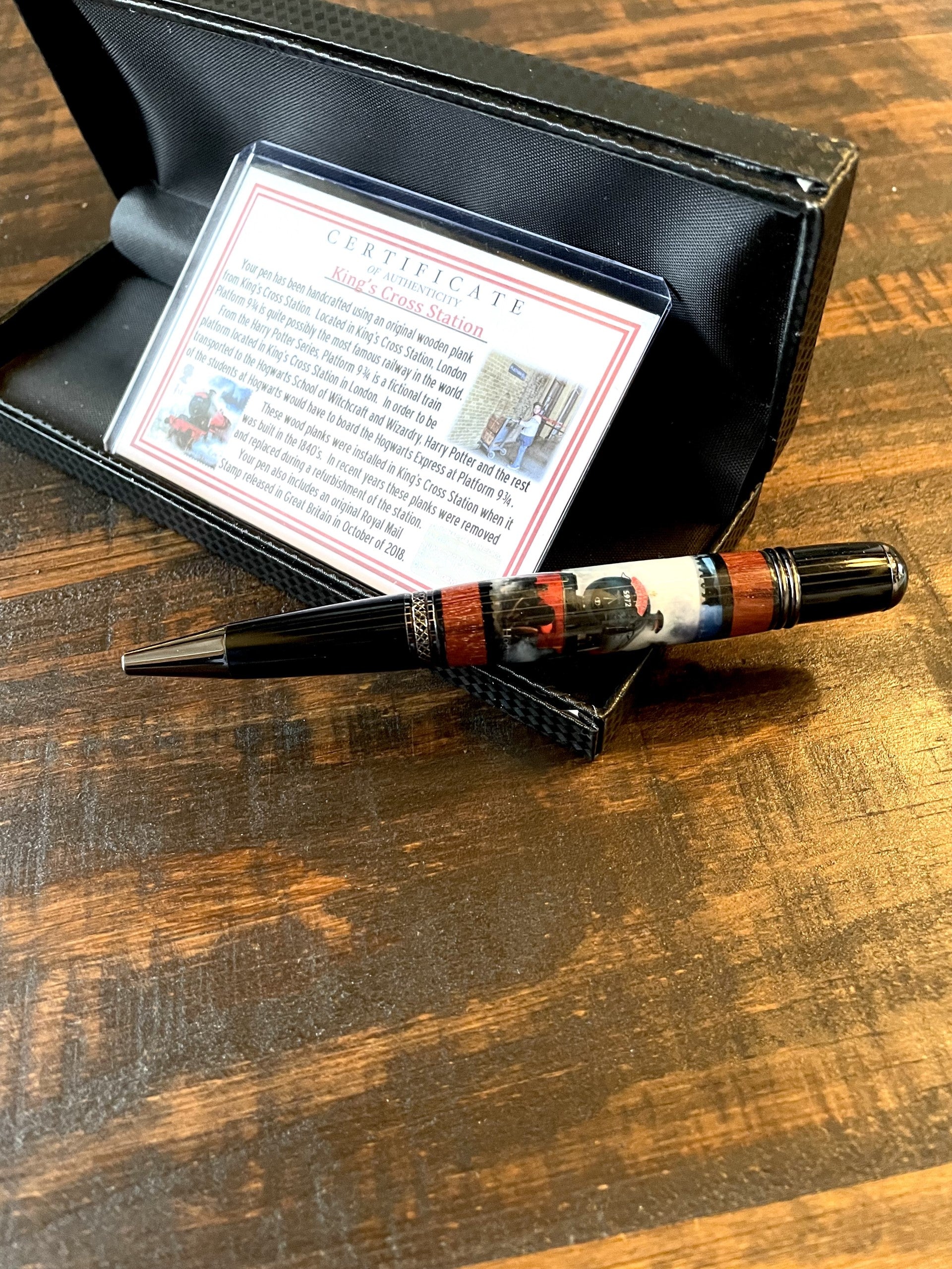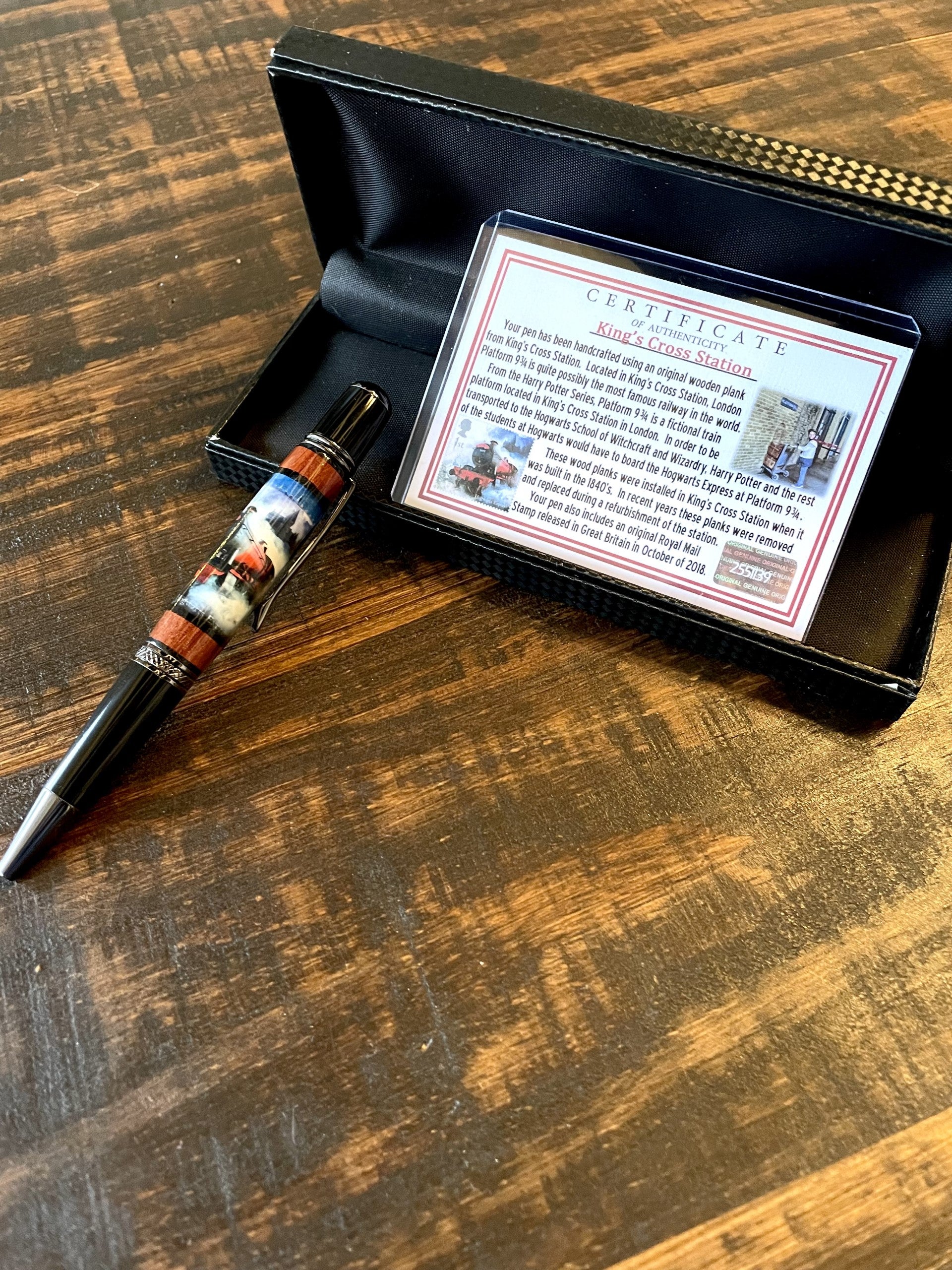 Calling all Harry Potter Fans! This handcrafted ballpoint pen uses original wood planks directly from King's Cross Station, the home of Platform 9 3/4. Located in King's Cross Station, London, Platform 9 3/4 is quite possibly the most famous railway in the world. The Platform is the home location for the famous Hogwarts Express. In order to be transported to Hogwarts, Harry Potter and friends board the train which is featured in several of the movies.