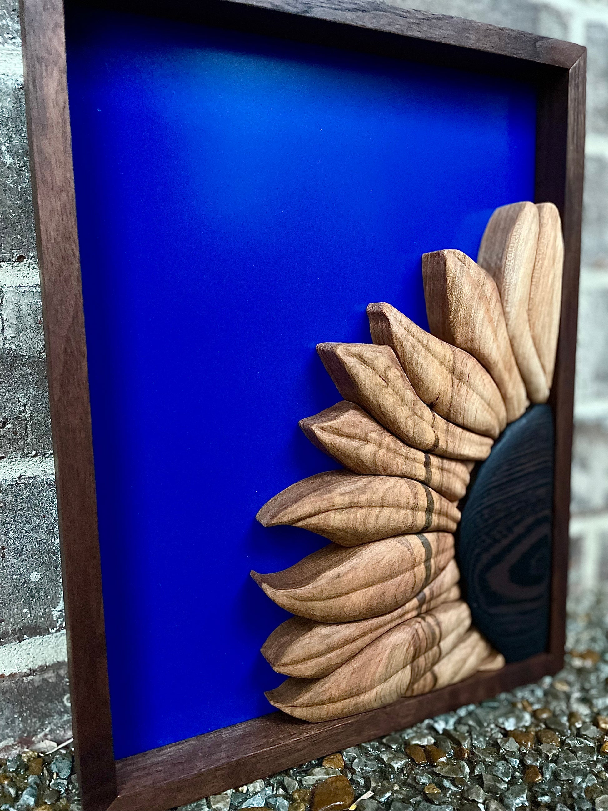 The sunflower has wenge wood in the center and ambrosia maple for the petals. The frame is walnut, while the backer is MDF that has been painted a bright blue for a pop of color. A colorless oil was applied to the wood show off the natural ccharacter and make the grain pop.There is a sawtooth style hanger on the back, making it ready to hang right away!Each piece is unique because of the differences in the wood and being made completely by hand. No two art pieces are exactly alike! The back is signed by the artist. The total measurements of the piece are 11.5” high x 9” wide x 1.5" deep.