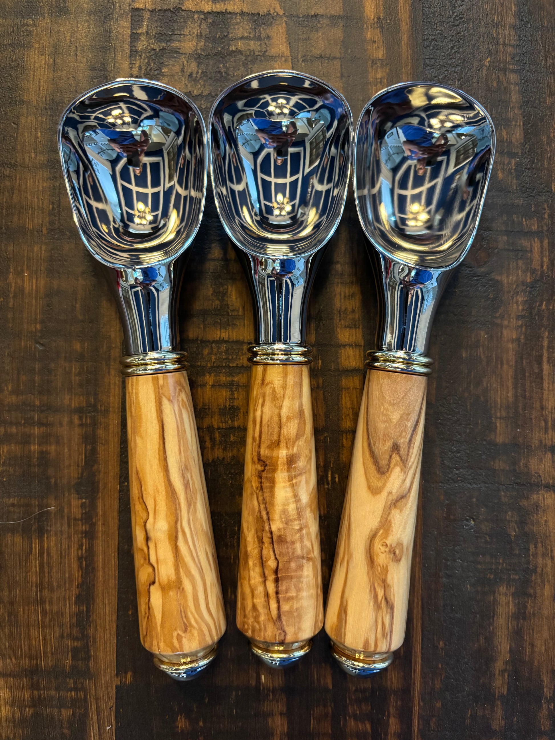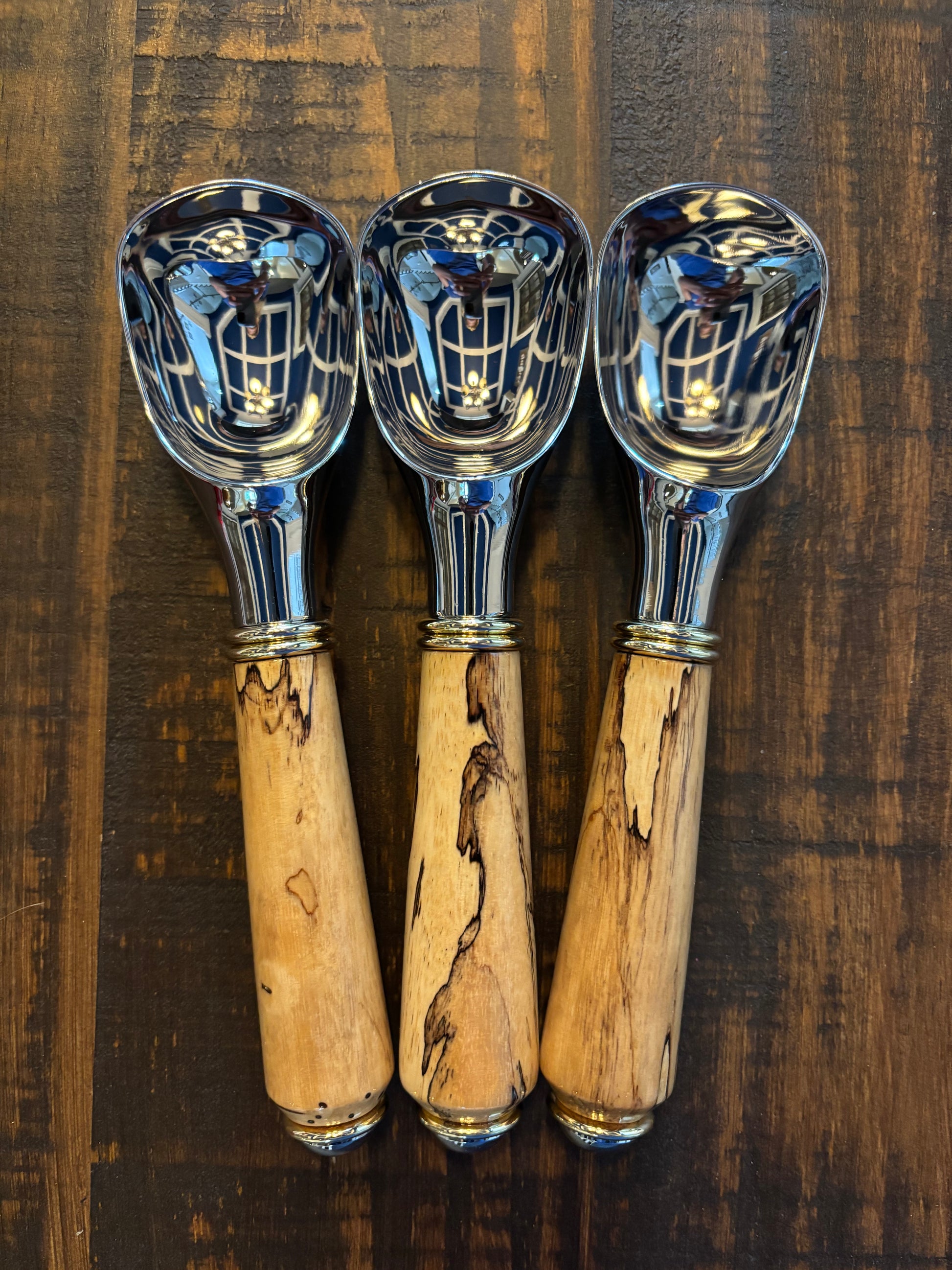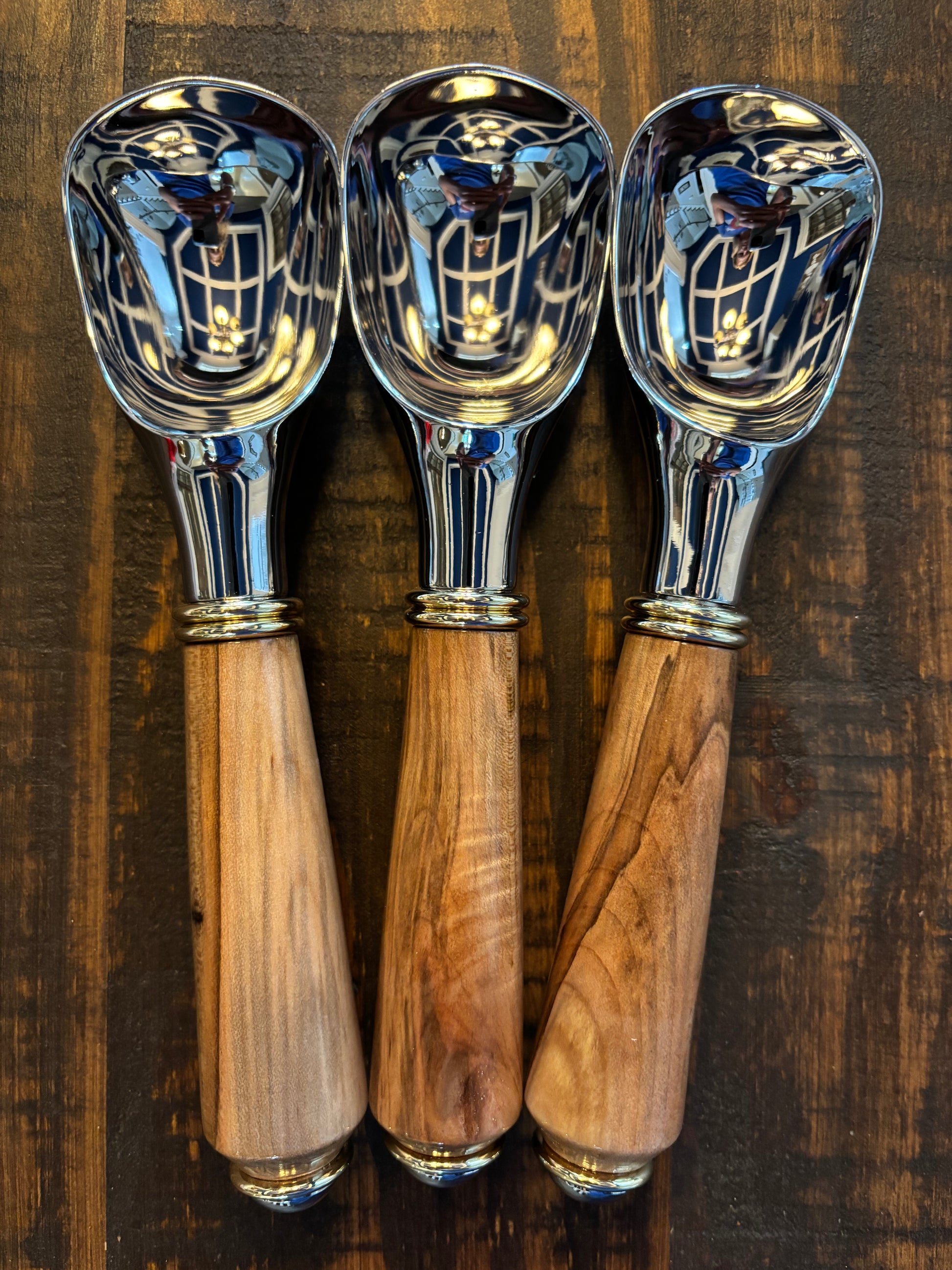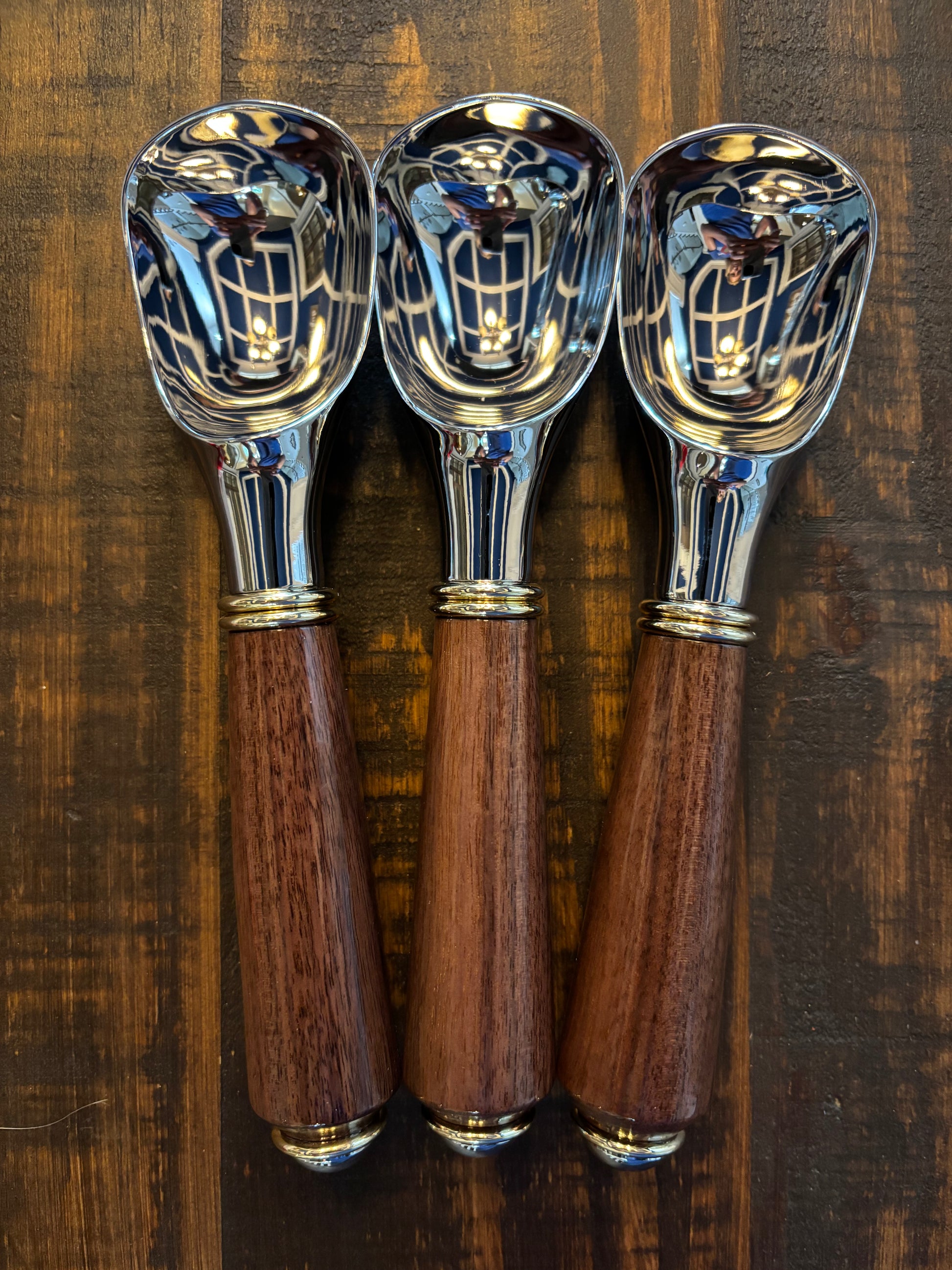 Just like there is always room for ice cream, there is always room for a gorgeous ice cream scoop to serve it! This beautiful scoop comes in a variety of wood choices, and the wood is coated with a CA finish for durability and shine. The metal is a chrome plated die cast zinc alloy that is food safe and stain and corrosion resistant. The decorative gold and chrome accents make this scoop a lovely addition to any kitchen!