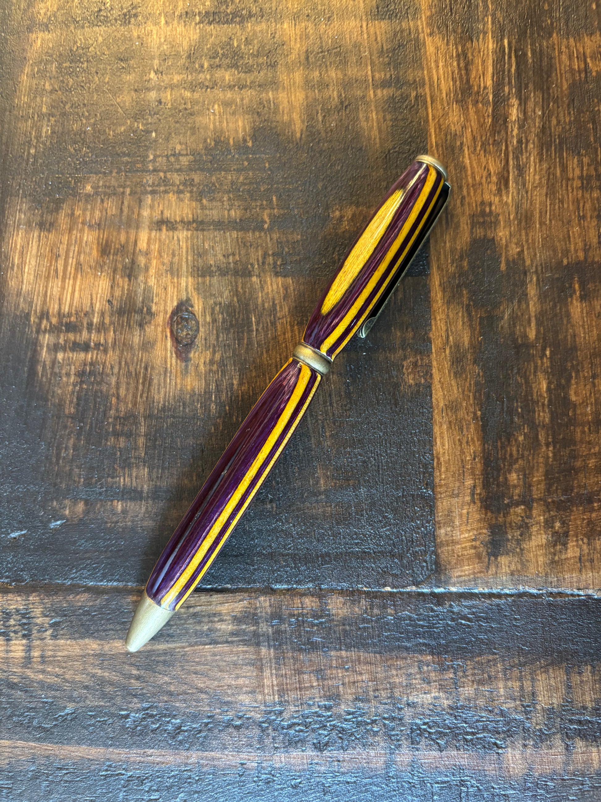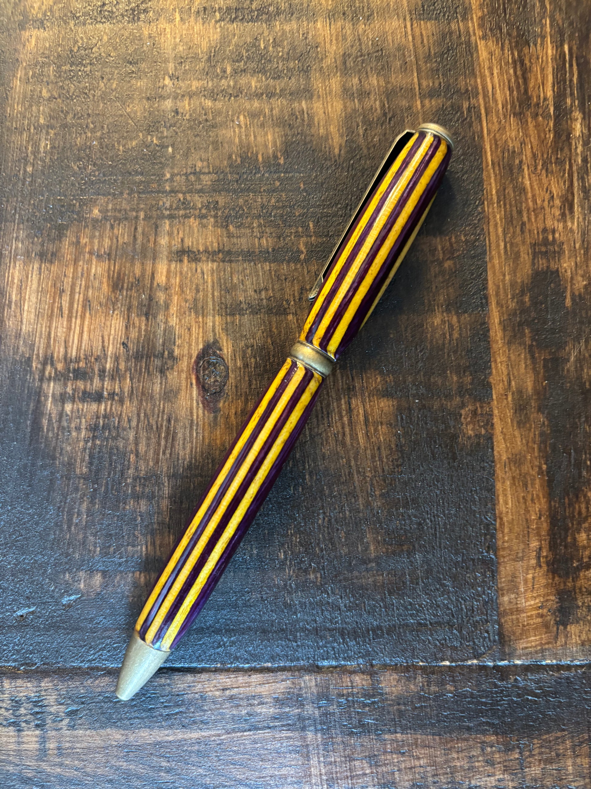 This Slim Style Pen with an antique gold finish comes with purple and yellow dyed wood and lots of character! The wood has a durable CA finish. The pen is a twist style to engage and retract the pen. It is perfect for everyday use!