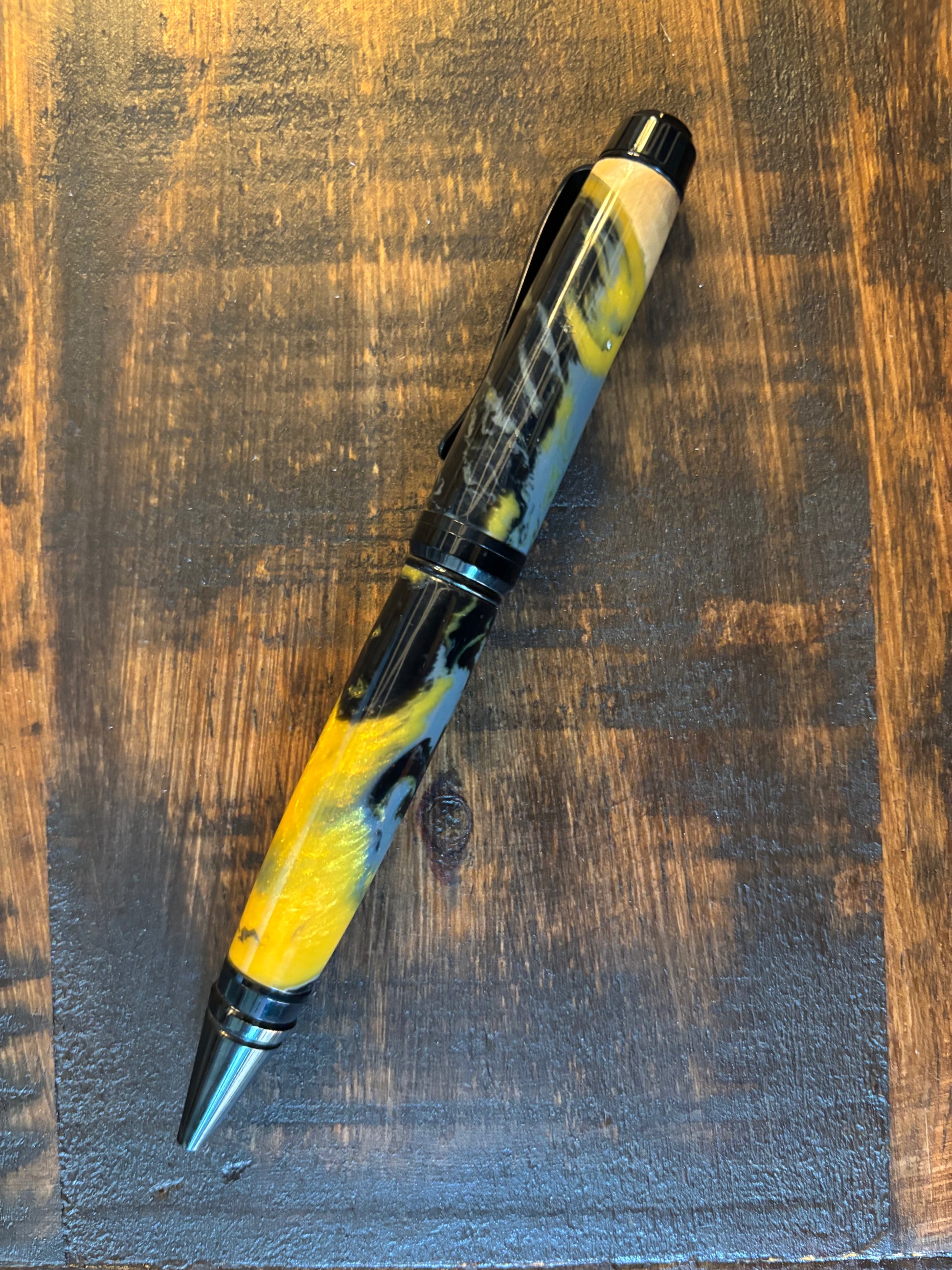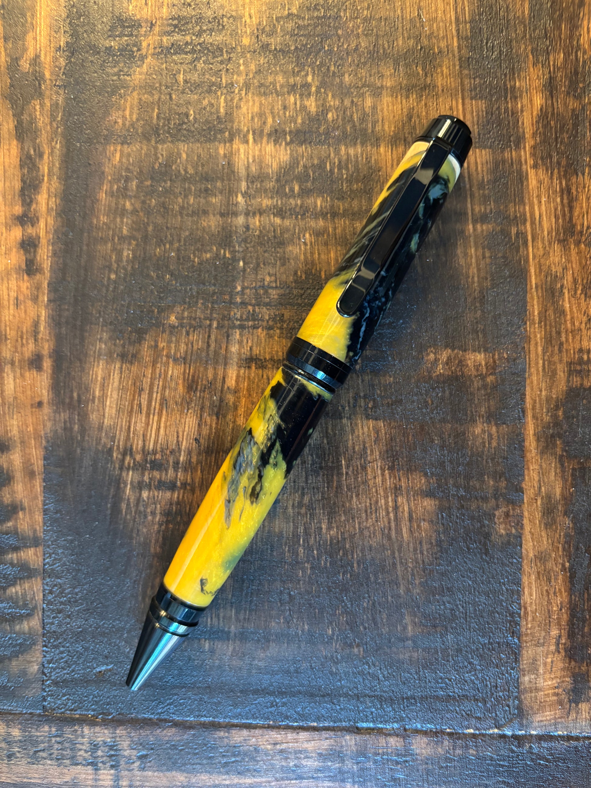 This executive style pen with a black finish comes with a hybrid of a small piece of wood at the top and yellow, black, and gray acrylic. It has lots of character! The wood/acrylic has a durable CA finish. The pen is a twist style to engage and retract the pen. It is perfect for everyday use!