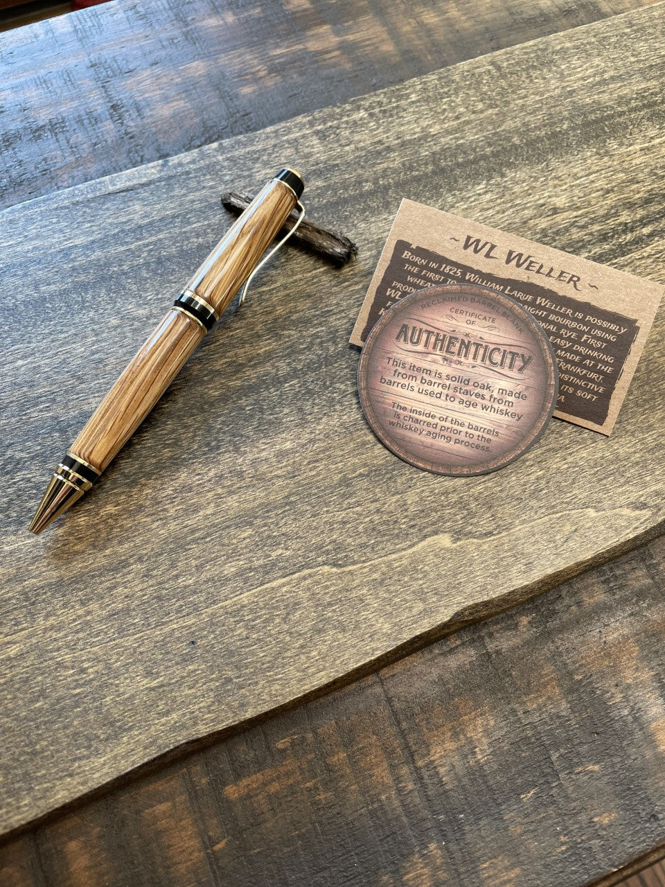 Attention Bourbon Lovers! This premier cigar style pen is made from the actual bourbon barrels used to make the hard to find and highly popular WL Weller bourbon. Choose from four available pen finishes that all look great with the oak wood including black, satin black, satin nickel, and gold or get one of each! Every pen comes with a Certificate of Authenticity and a card telling you about the Buffalo Trace distillery. The premier cigar pen leverages a twist style to engage and retract the pen. It is perfect for everyday use and makes for a great gift!