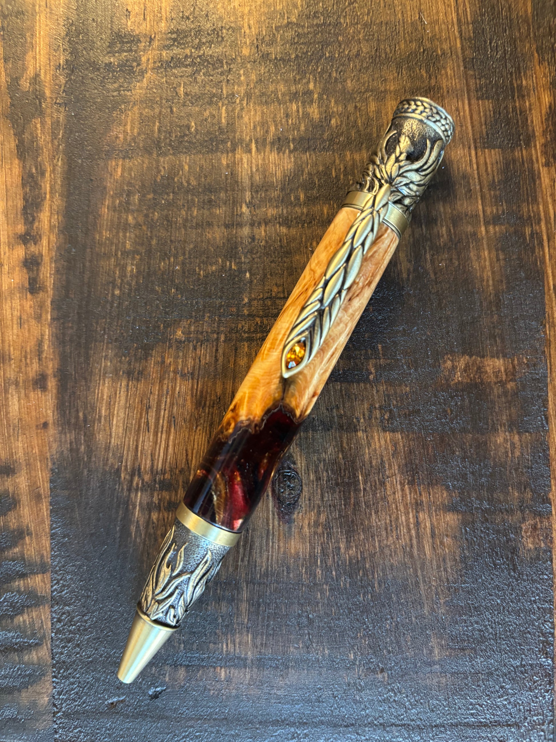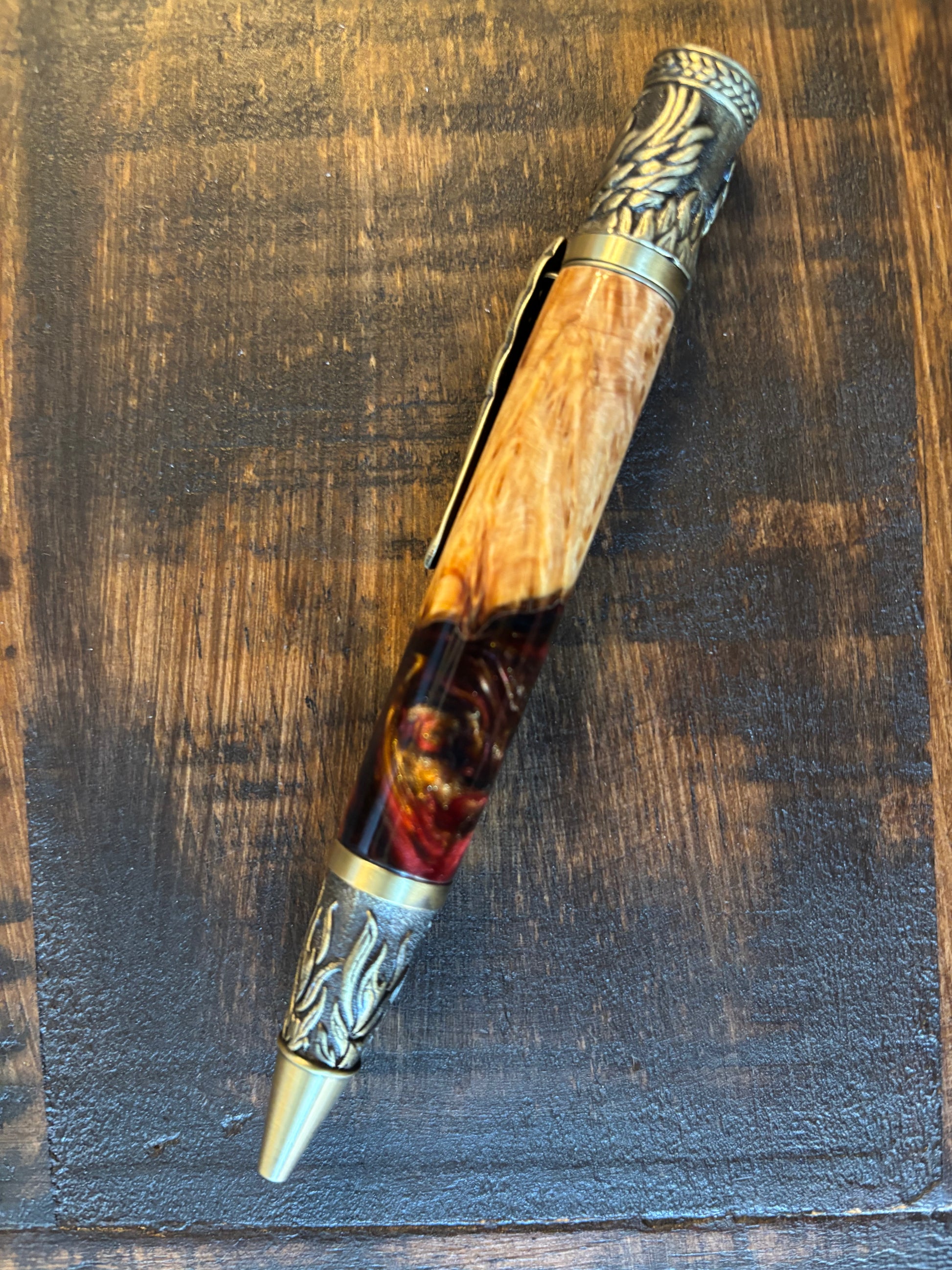 This executive style pen with an antique brass finish comes with a hybrid of burled wood and acrylic and lots of character! The wood/acrylic has a durable CA finish. This pen features flames bursting at the tip and a rising phoenix; its tail rendered in the clip. Amber crystals on the clip and cap add to the majesty of this regal creature. The pen is a twist style to engage and retract the pen. It is perfect for everyday use!